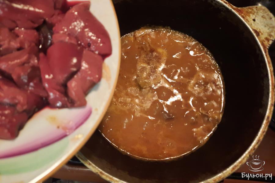 9. Добавить в казан воды, соль и перец. Перемешать, закрыть крышкой и тушить до готовности субпродуктов.