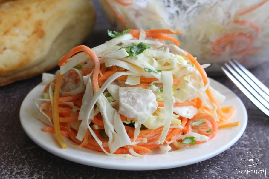 Капустный салат с корейской морковкой и вареной курицей понравится многим, салат хрустящий, сочный, вкусный и полезный. Вместо майонеза такой салат можно заправить сметаной или даже душистым, растительным маслом. Количество ингредиентов можно менять, добавить больше морковчи, куриного мяса или наоборот меньше. Зелень в салат можно добавить ту, которая нравится вам. Этот аппетитный салат отлично подойдет к обеду или ужину.
