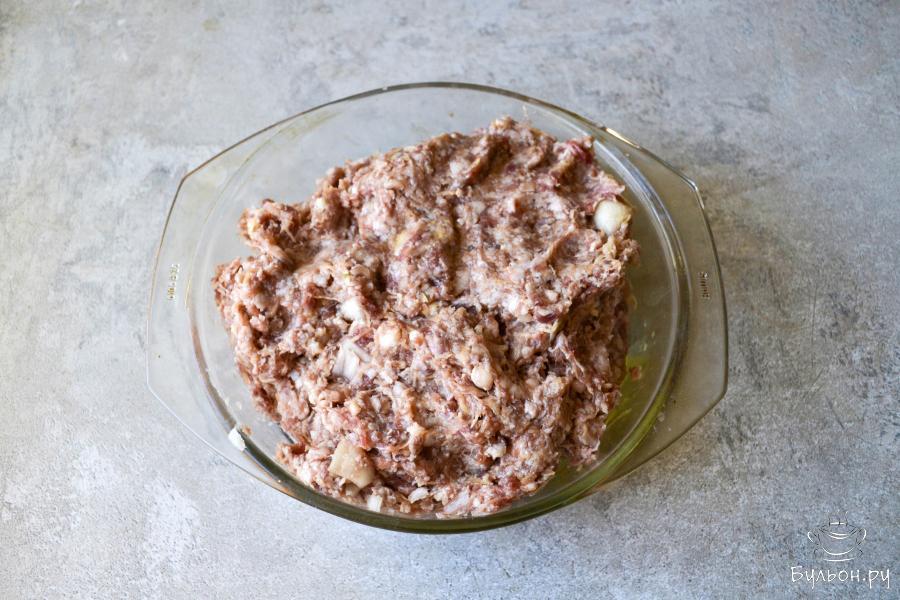1. В глубокую миску положите мясной фарш, натертую на мелкой терке картошку, яйцо, соль, перец черный молотый.