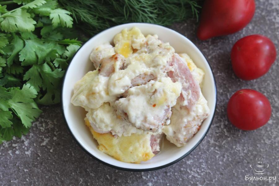 1. Куриные грудки промыть, мелко нарезать и выложить в форму для запекания. Добавить соль и хмели-сунели, перемешать.