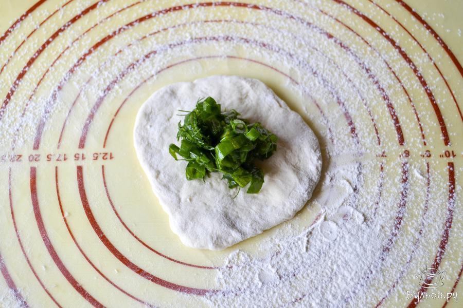 6. Тесто разделите на небольшие кусочки. Кусочек растяните руками в лепешку, толщиной 5-7 мм, в центр положите луковую начинку.