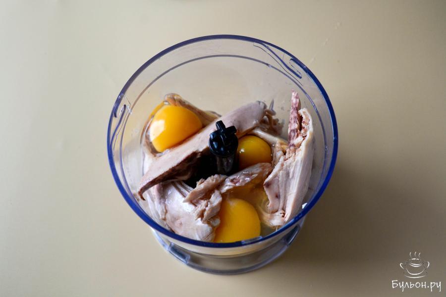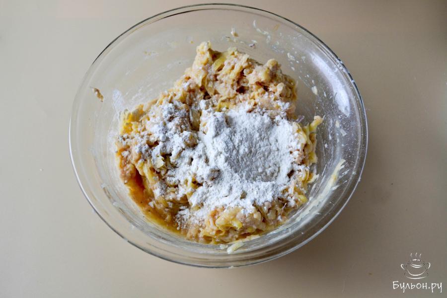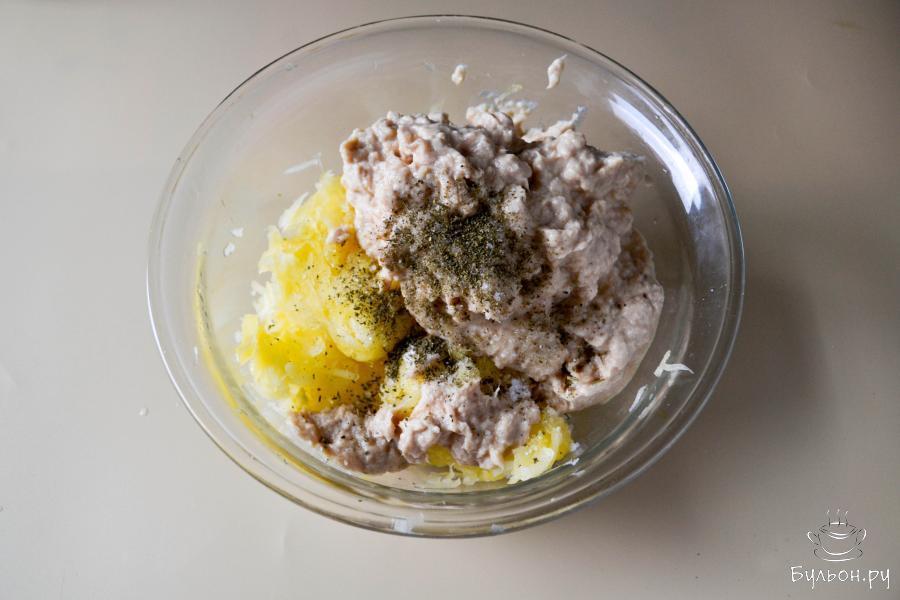 5. Руками отожмите сок с кабачка. Добавьте в миску с кабачком измельченную куриную грудку с яйцами, растительное масло. Добавьте соль и черный молотый перец. Перемешайте.