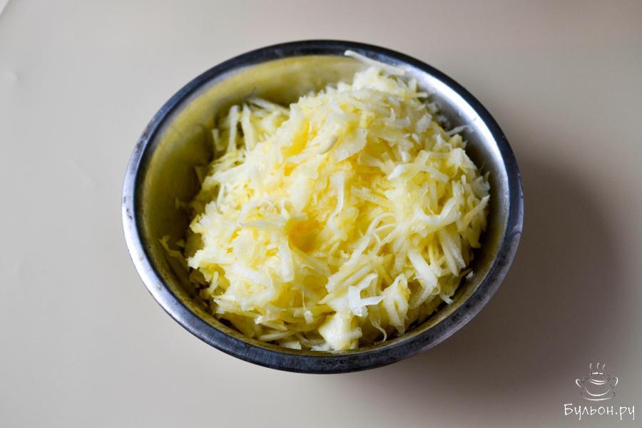 1. Кабачок вымойте, очистите от шкурки и семечек. Натрите на крупной терке, оставьте на 10 минут, чтобы дал сок.