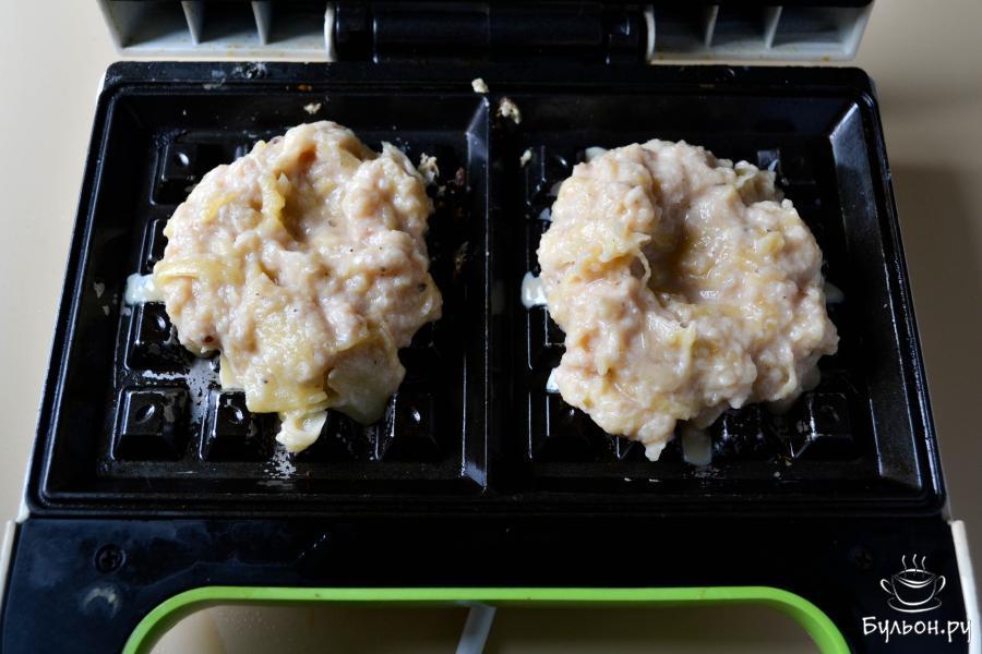 7. Разогрейте электровафельницу. Смажьте панели растительным маслом и положите по полной столовой ложке теста на одну вафлю.