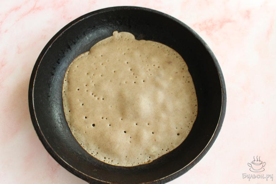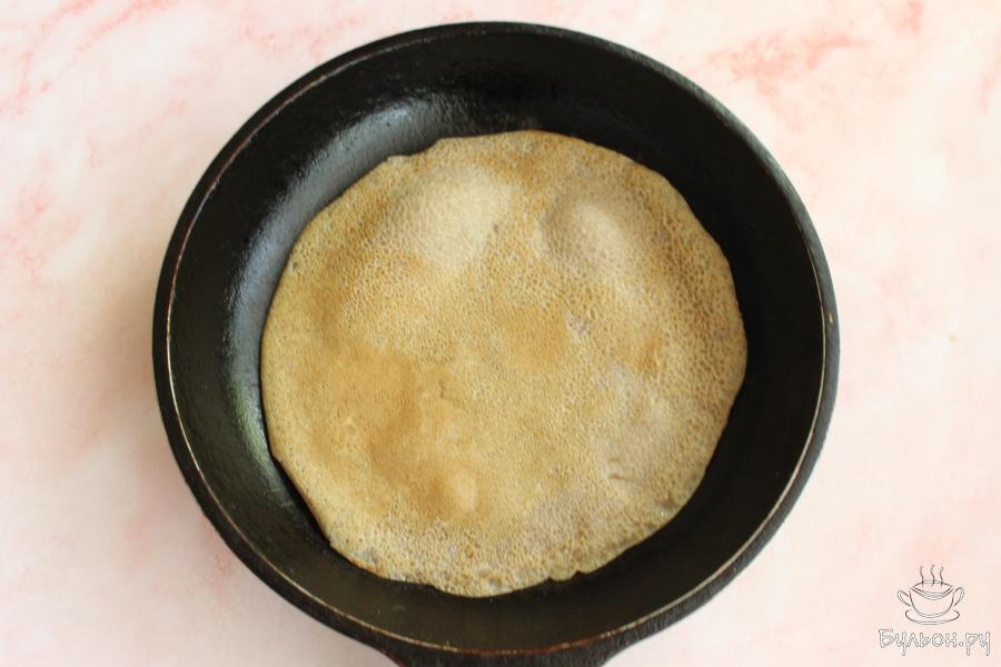 5. Сковороду хорошо разогреть. Выливать на сковороду тесто и распределять его круговыми движениями по сковороде. Готовить блин до румяного низа.
