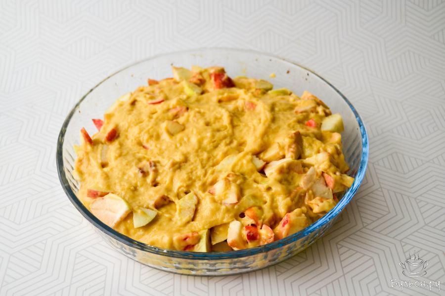 7. Форму поставьте в разогретую до 180С духовку. Выпекайте пирог примерно 30-40 минут. Готовность пирога проверьте деревянной шпажкой. Она должна выходить полностью сухой из центра пирога.