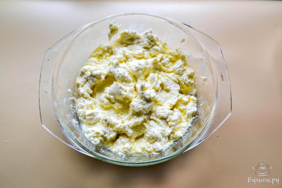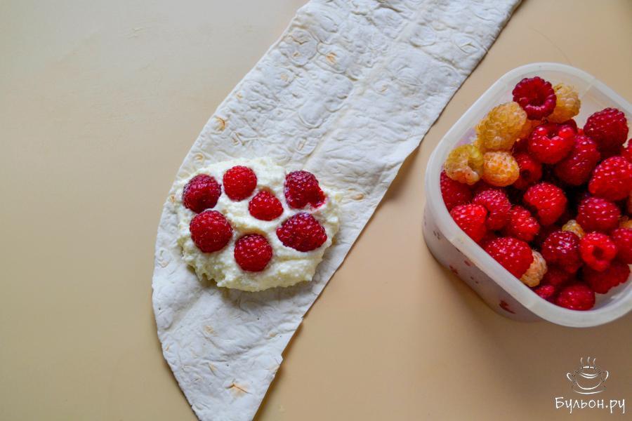 4. На край полоски положите творожную начинку. На нее положите несколько ягод малины, слегка вдавите их в творог.