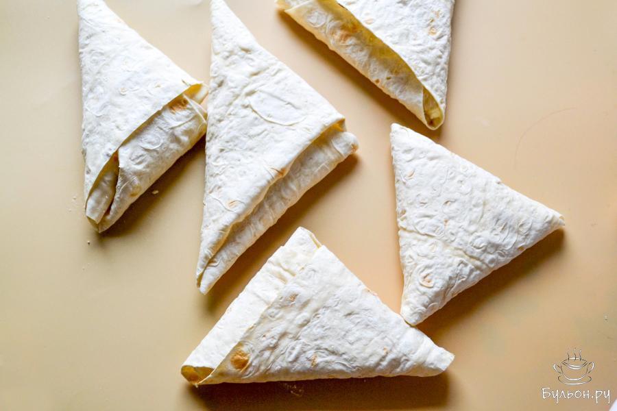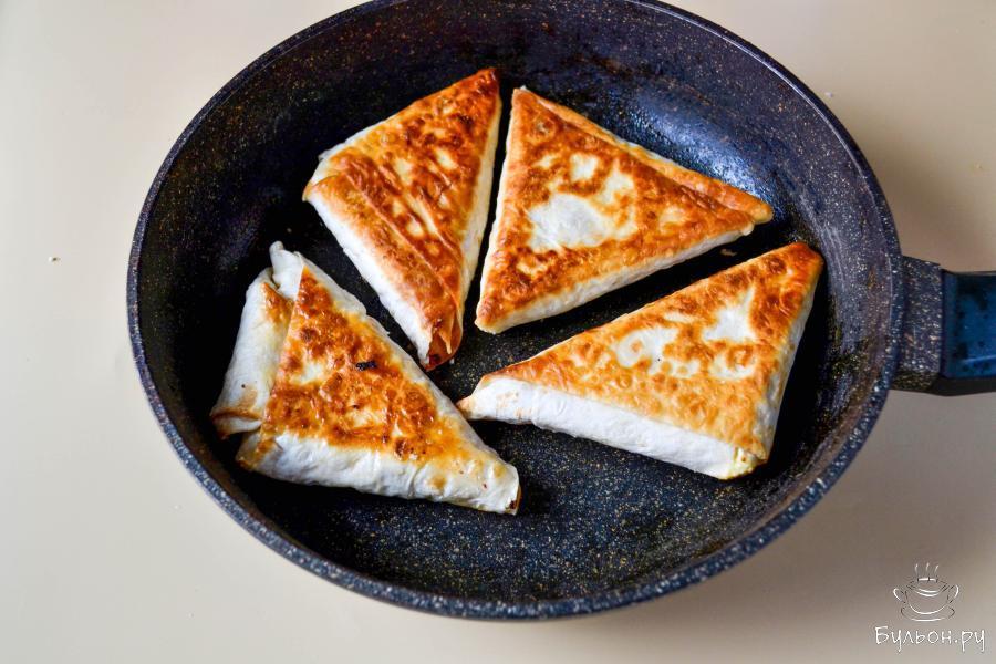 7. Разогрейте сковороду с растительным маслом и обжарьте треугольники до золотистой корочки, поочередно, с обеих сторон.