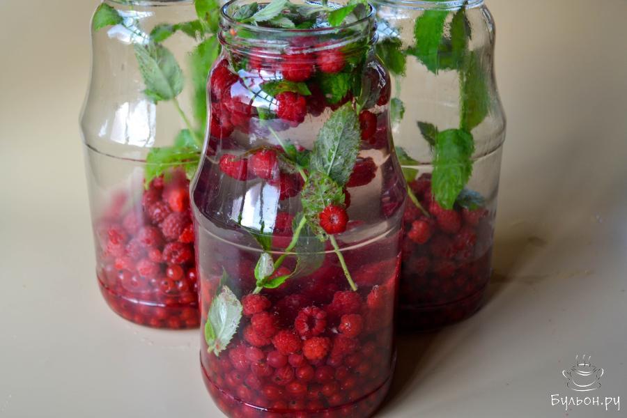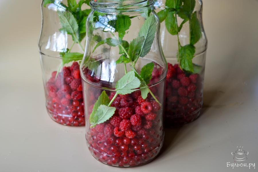 1. Ягоды переберите. Смородину снимите с веточек и промойте в большом количестве воды, ветки мелиссы промойте и отряхните от воды. Сложите смородину, малину и мелиссу в промытые и простерилизованные банки. Крышки прокипятите 3-4 минуты после закипания.