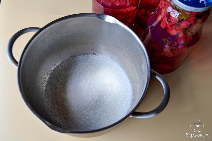 4. Спустя указанное время, слейте воду из банок в кастрюлю и поставьте на огонь. Проварите после закипания несколько минут, чтобы сахар полностью растворился.