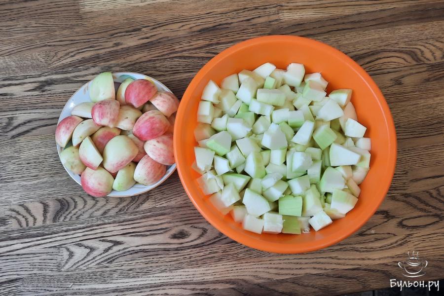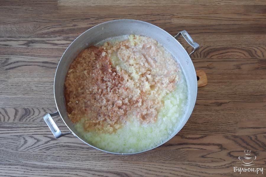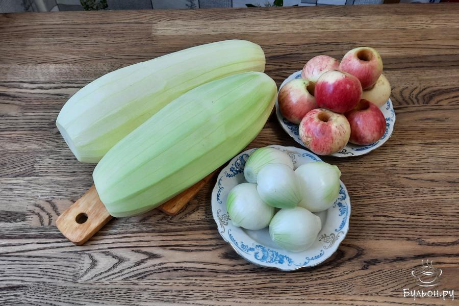 3. Прокрутить кабачки и яблоки через мясорубку с мелкой решеткой. Выложить в глубокую кастрюлю и поставить на огонь. После закипания, тушить кабачки с яблоками 1 час. Периодически помешивать.