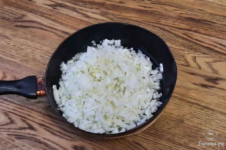 4. Пока кабачки тушатся, подготовить лук. Мелко нарезать его и обжарить на сковороде с разогретым маслом. Использовать масло надо сразу все.