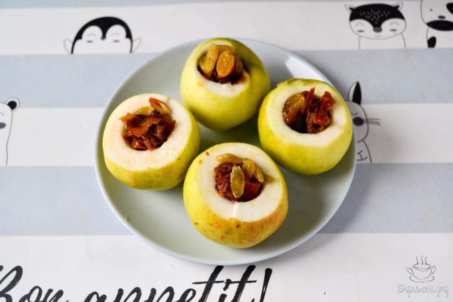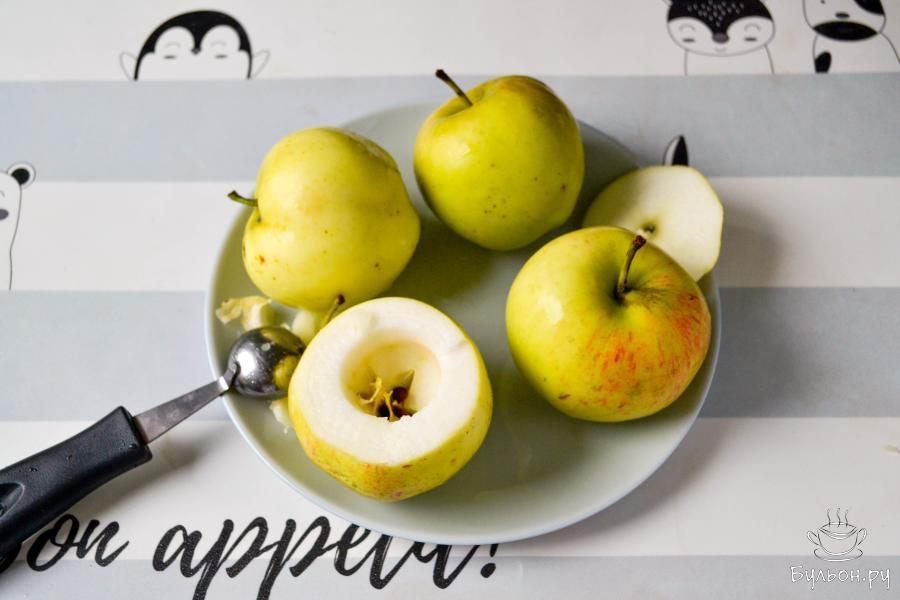 2. Срежьте небольшую верхушку с яблок и специальным ножом выньте немного мякоти с семечками. Будьте аккуратны - стенки и донышко яблока должны остаться целыми. Вместо ножа можно использовать чайную ложечку.