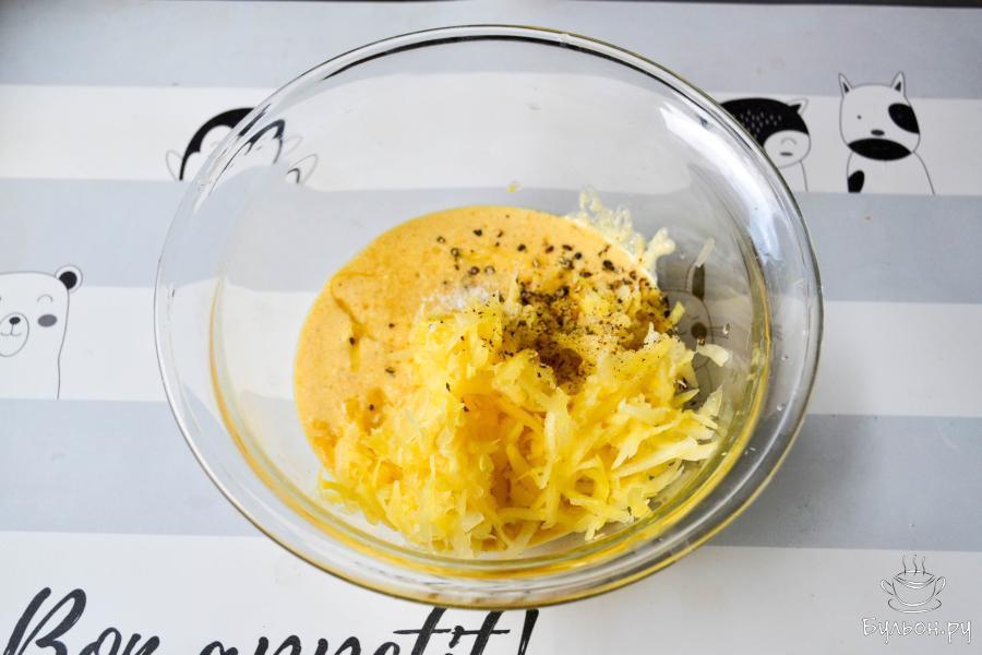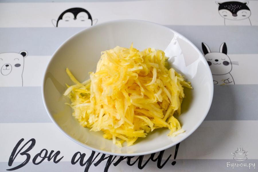 1. Кабачок очистите от кожуры и семян, натрите на крупной терке, оставьте на 10 минут, чтобы дал сок.