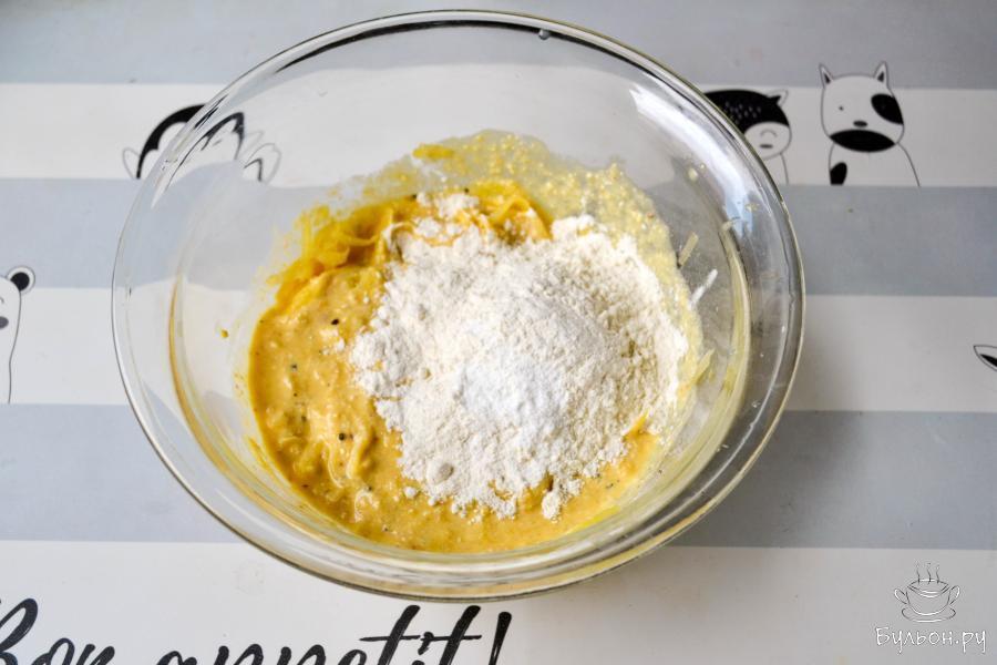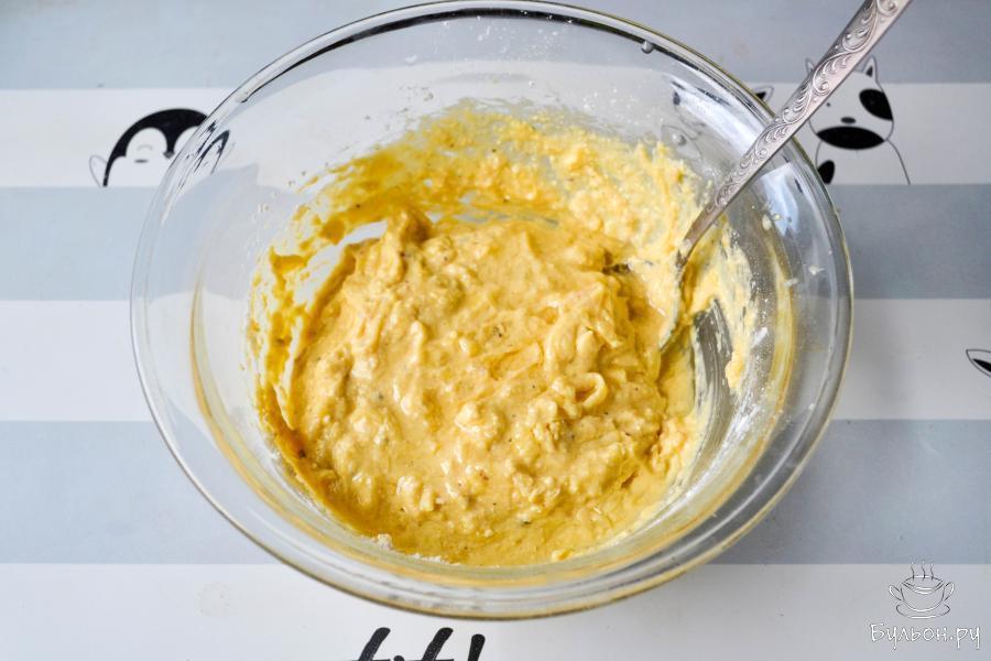 6. Перемешайте. Количество муки может немного отличаться от указанного. Оно будет зависеть от сочности кабачка и влажности творога. Добавьте растительное масло и перемешайте.