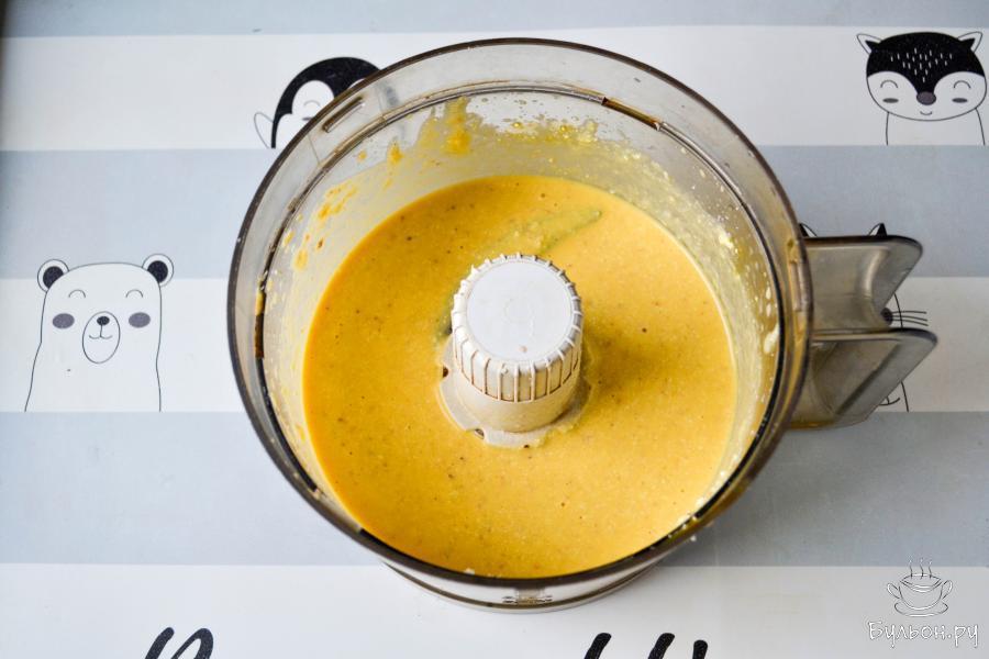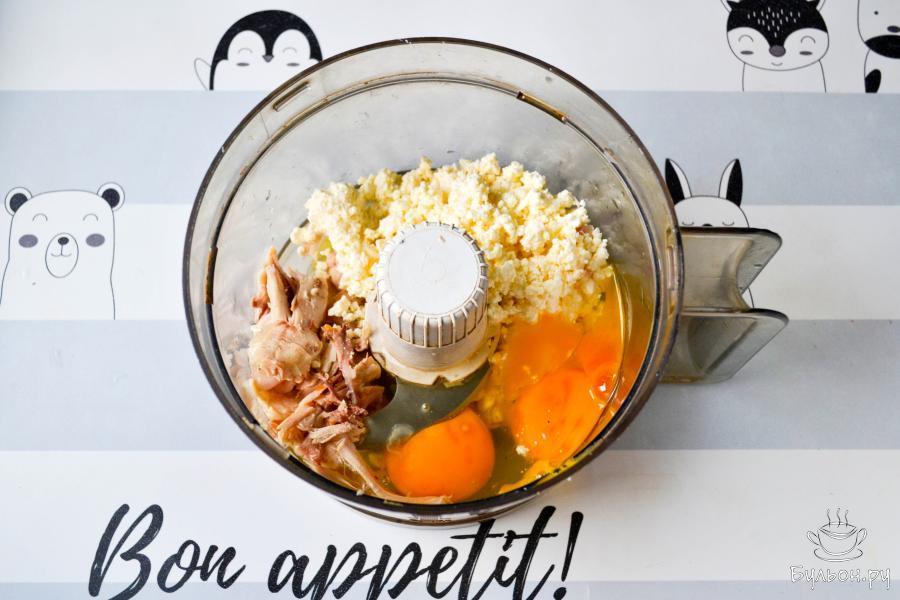 4. Перелейте смесь из чаши измельчителя в другую миску. добавьте отжатый от сока кабачок, добавьте соль и черный молотый перец.