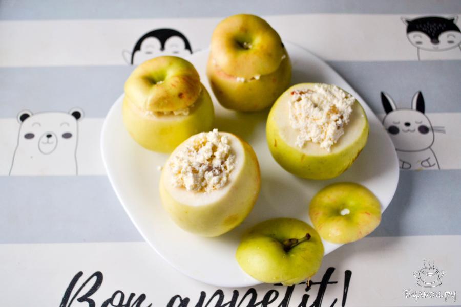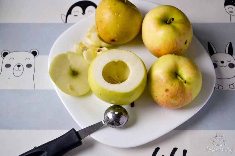2. Яблоки вымойте, обсушите, срежьте верхушки и специальным ножом вырежьте семечки с небольшим количеством мякоти.