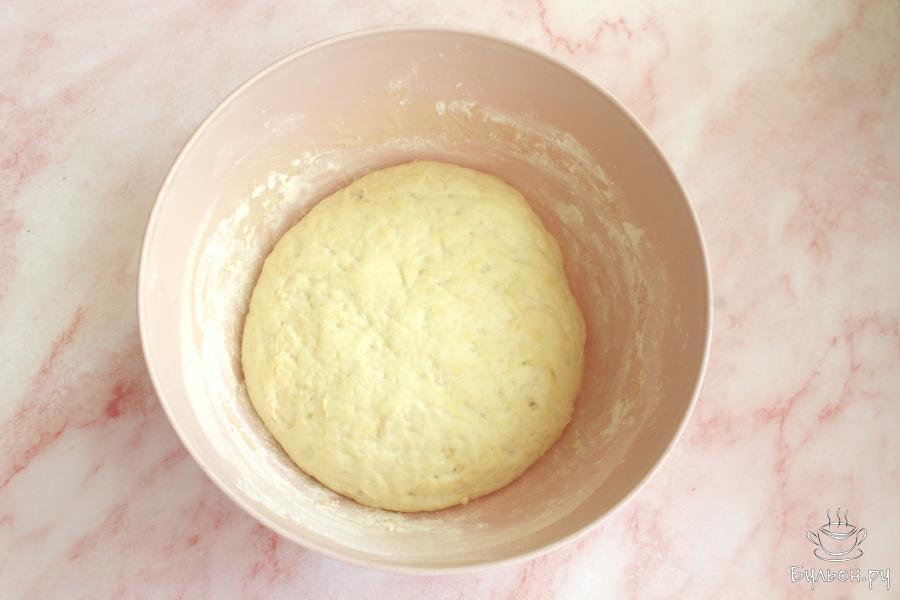 5. Добавить в чашку оставшуюся муку и замесить мягко тесто. Чашку накрыть и оставить минут на 40 или на час в теплом месте.