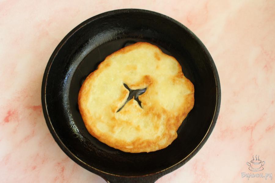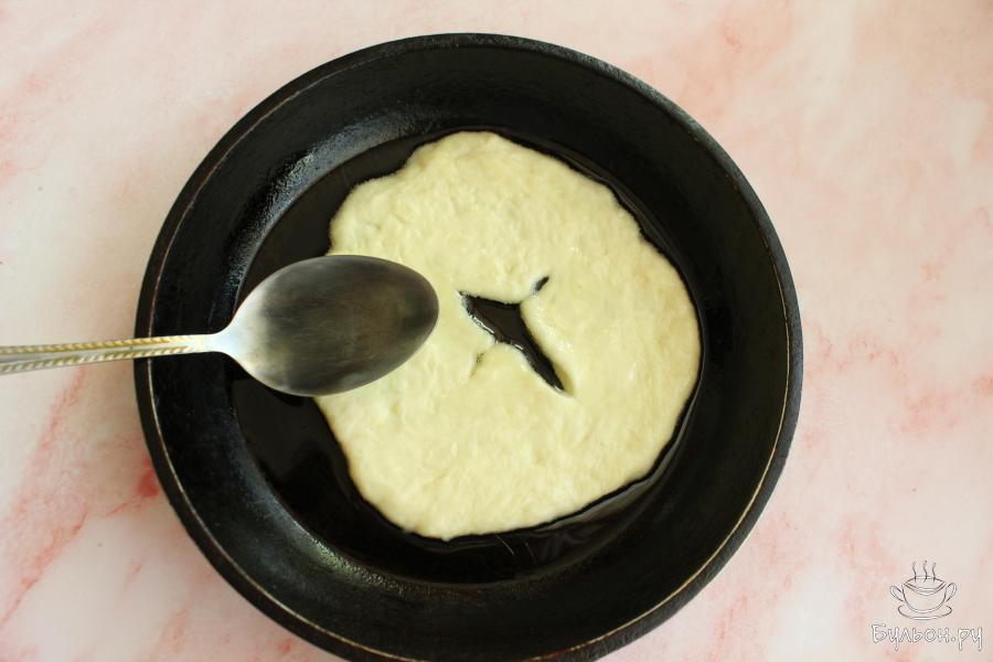 8. На сковороде хорошо разогреть 2 ст. л. масла. Выложить лепешку на сковороду, сразу зачерпывать ложкой горячее масло и несколько раз поливать лепешку. Готовить лепешку до румяного низа.