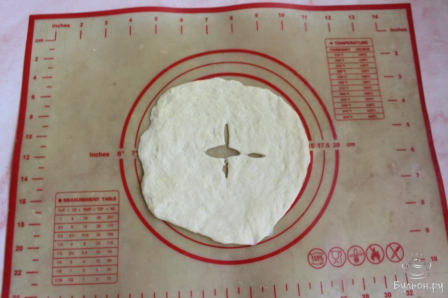 7. Руки и рабочую поверхность смазать растительным маслом. Тесто разделить на 6-7 частей. Раскатать тесто в круги толщиной примерно 3-4 мм. Серединку лепешек надрезать или наколоть всю лепешку вилкой.