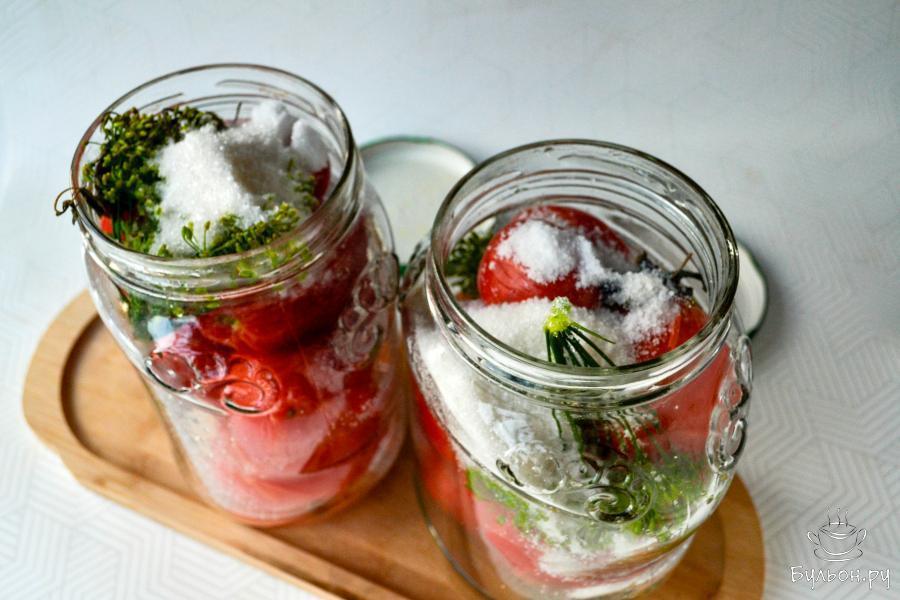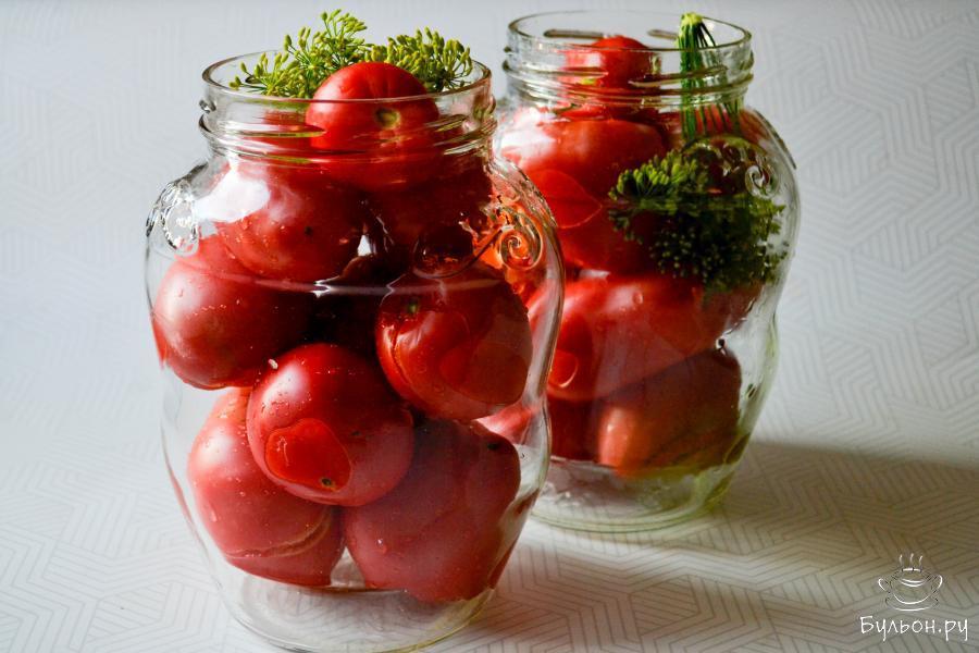 3. Помидоры и зонтики укропа вымойте. Банки промойте и простерилизуйте. Заполните банки помидорами, укропом, добавьте базилик. Количество томатов будет зависеть от их размера.