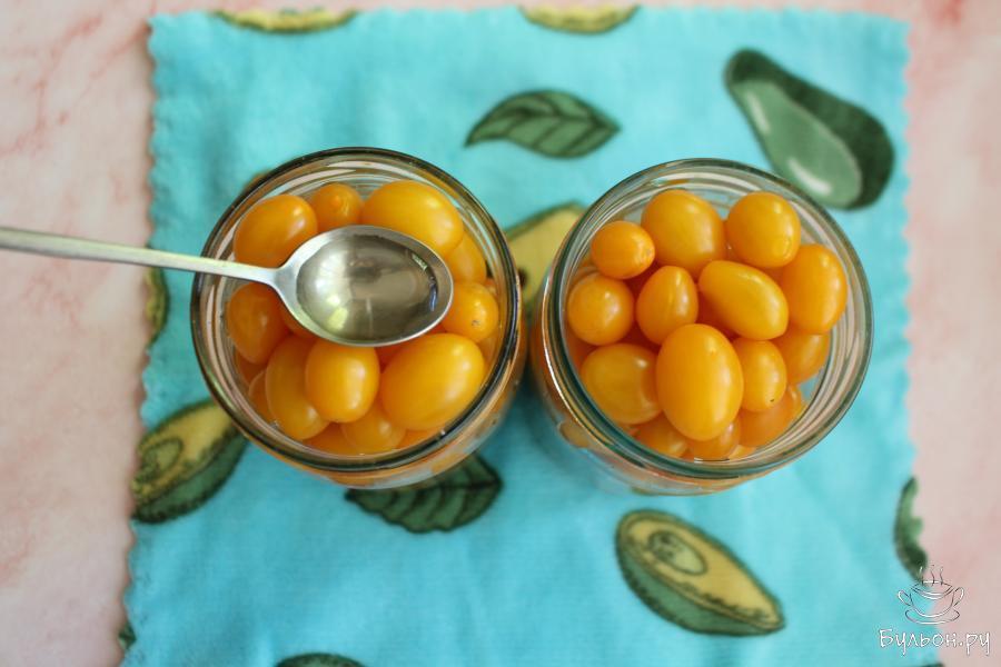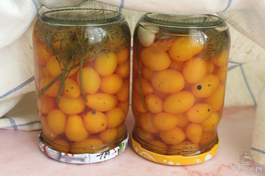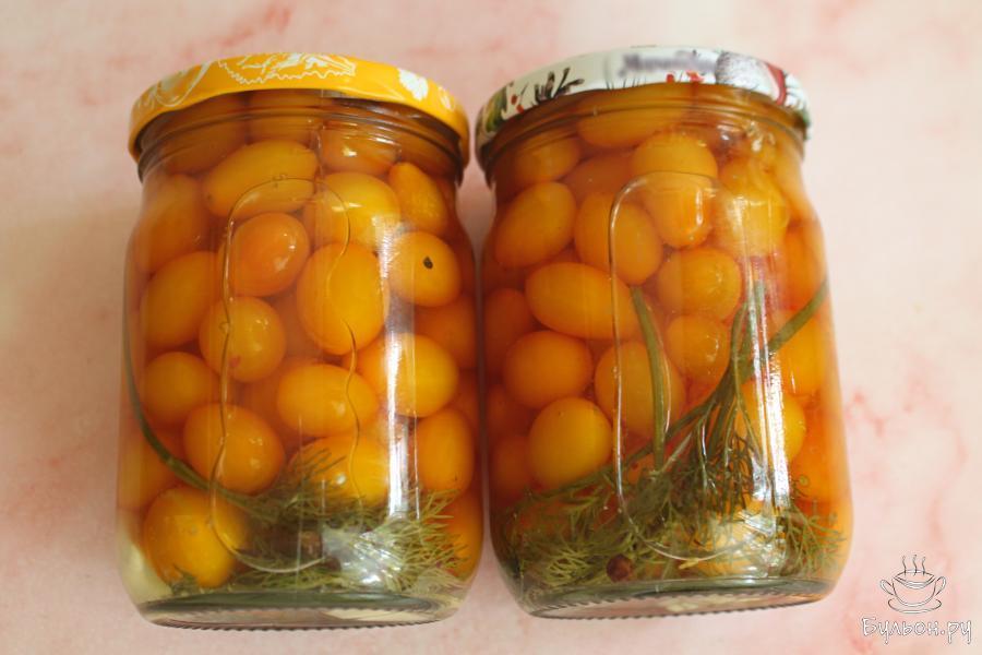 Маринованные желтые помидоры черри на зиму, порадуют вас не только своим вкусом, но и ярким, аппетитным видом. Зимой руки сами тянутся к таким красивым баночкам с маринованными помидорами, чтобы открыть их и подать к столу. Если вы не любите острые маринады, то острый перец можно не добавлять. Количество уксуса можно уменьшить. Предлагаю добавить половину уксуса в рассол и попробовать его. Если уксуса будет не хватать, то всегда можно будет добавить еще уксуса в маринад. Таким образом вы подберете нужное количество уксуса именно для вас, а уже в следующий раз можно будет распределить его сразу по баночкам. Эти маринованные помидоры отлично хранятся при комнатной температуре.