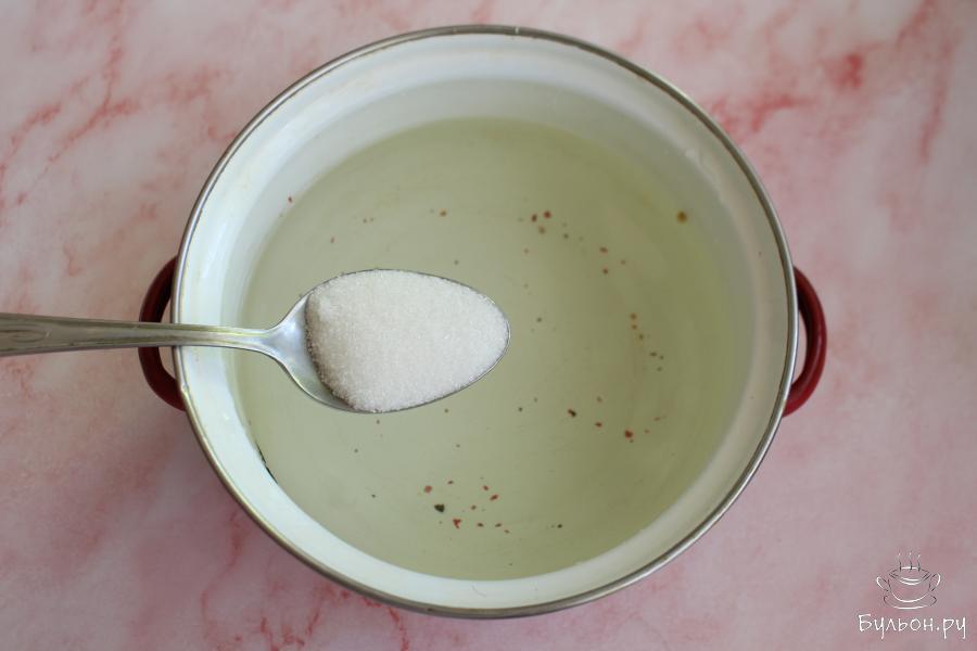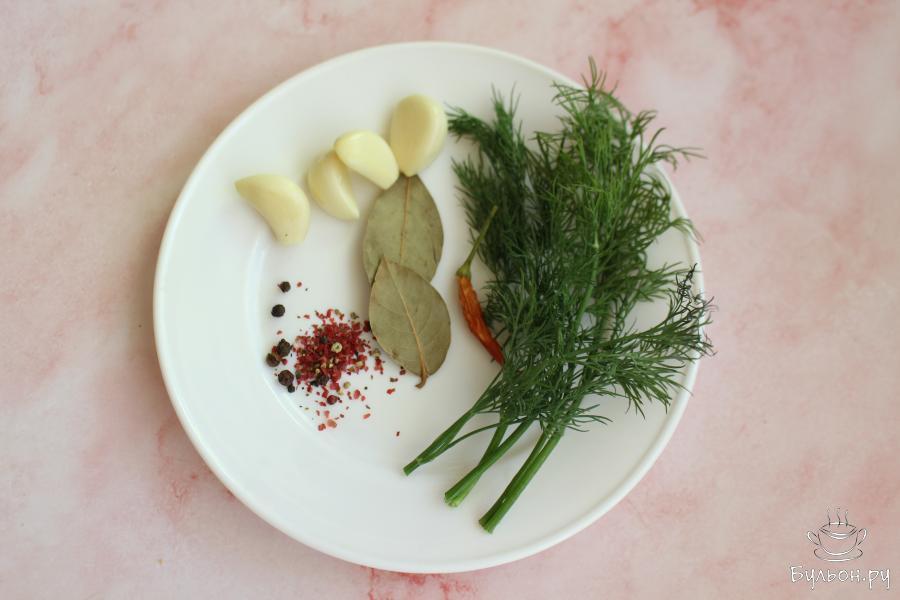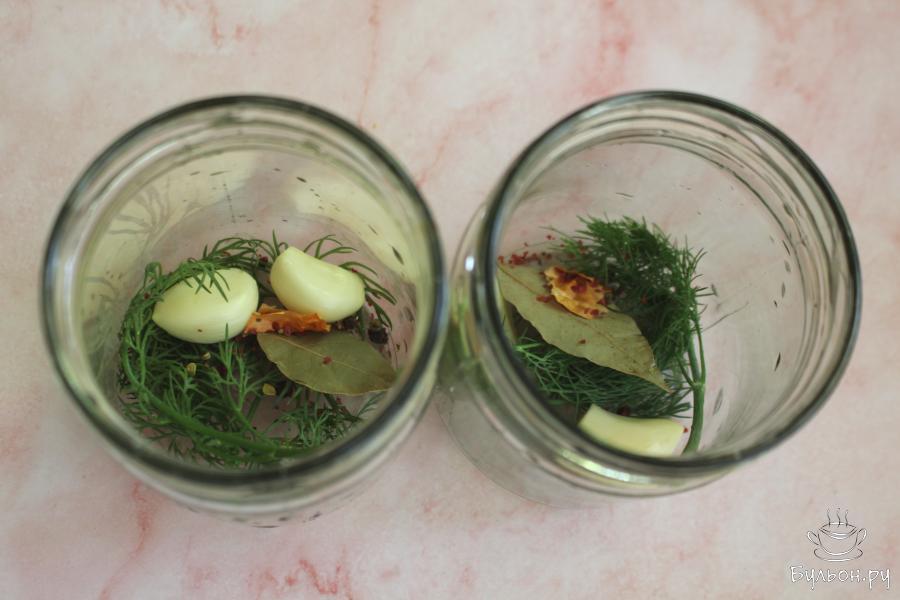 3. Разложить в две баночки по паре зубчиков чеснока, по паре веточек укропа, по лавровому листу, по 3-4 горошины перца, по кусочку острого перца.