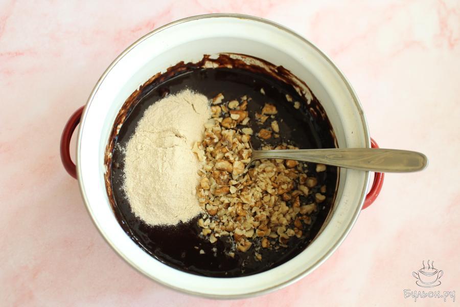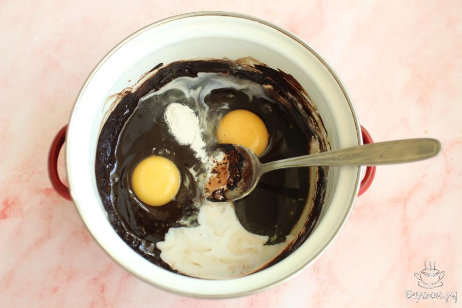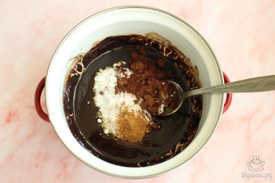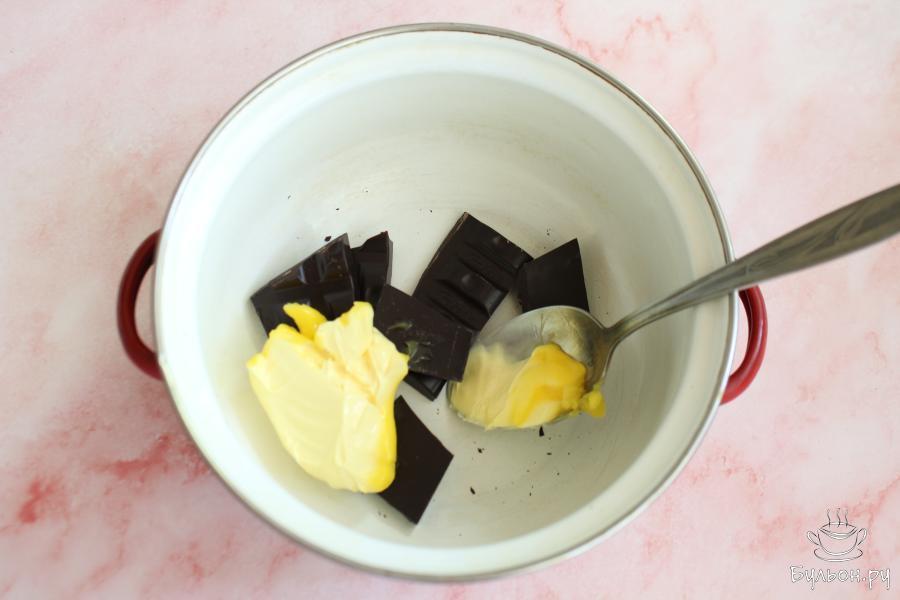 1. В кастрюльку выложить ломтики шоколада и сливочное масло. Поставить посуду на маленький огонь, постоянно помешивать и растопить шоколад с маслом.