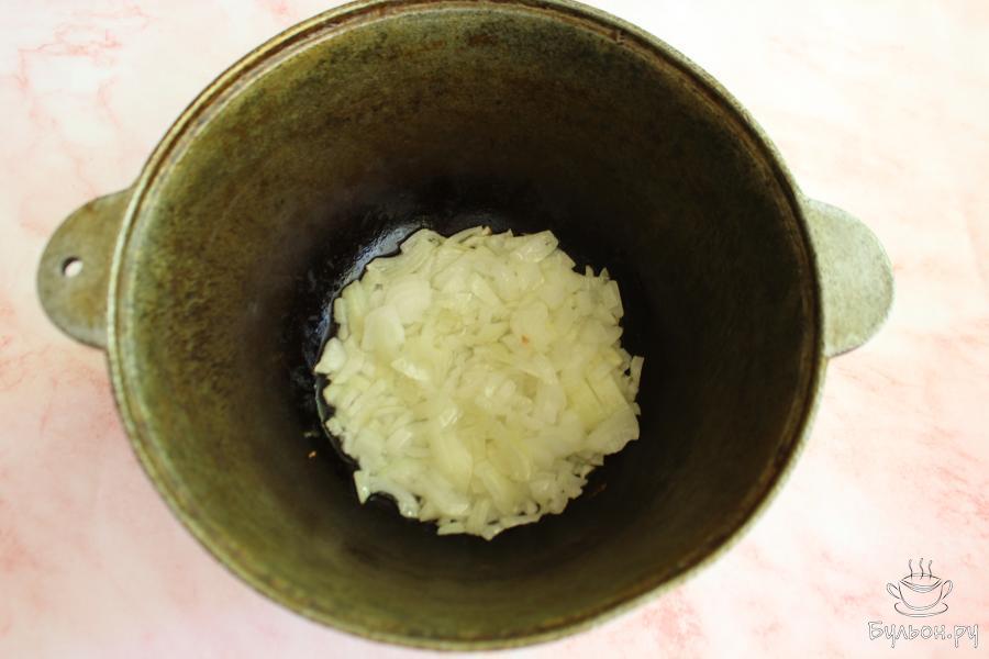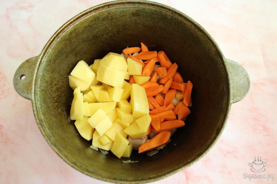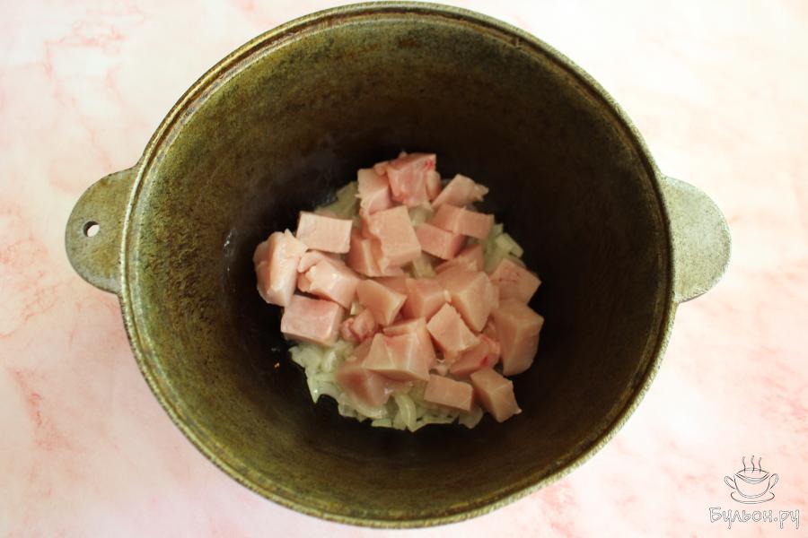 2. Куриную грудку нарезать небольшими кубиками, выложить в казан и обжарить все вместе 2-3 минуты. Помешивать.