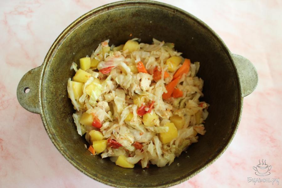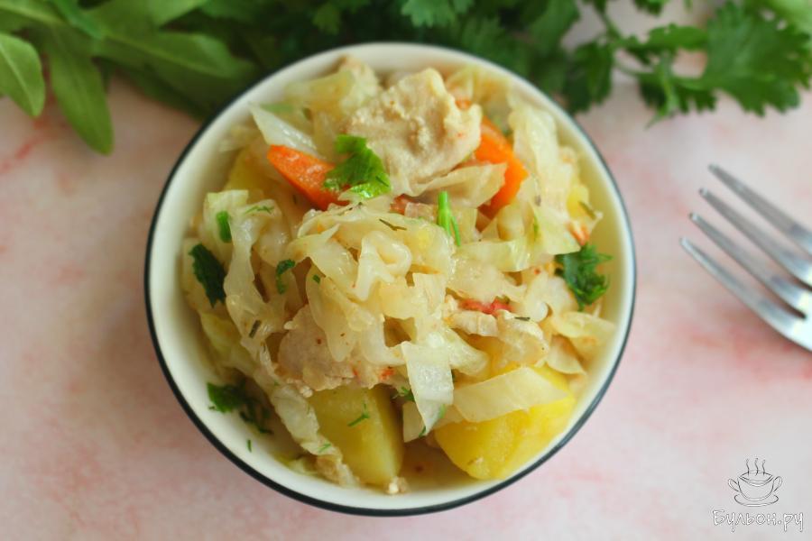 Тушеная картошка с курицей и капустой в казане буде готова быстро, готовить такое блюдо очень просто. Количество овощей дано примерное, всегда можно добавить любимых овощей больше, а менее любимых овощей - поменьше. Зелень для приготовления выбирайте ту, которая вам нравится. Приправы тоже можно менять, использовать любимые пряности. Блюдо получается сочное, легкое, вкусное и полезное. Такие тушеные овощи вкусные как в горячем, так и в холодном виде.