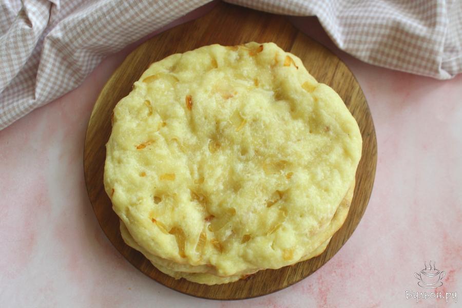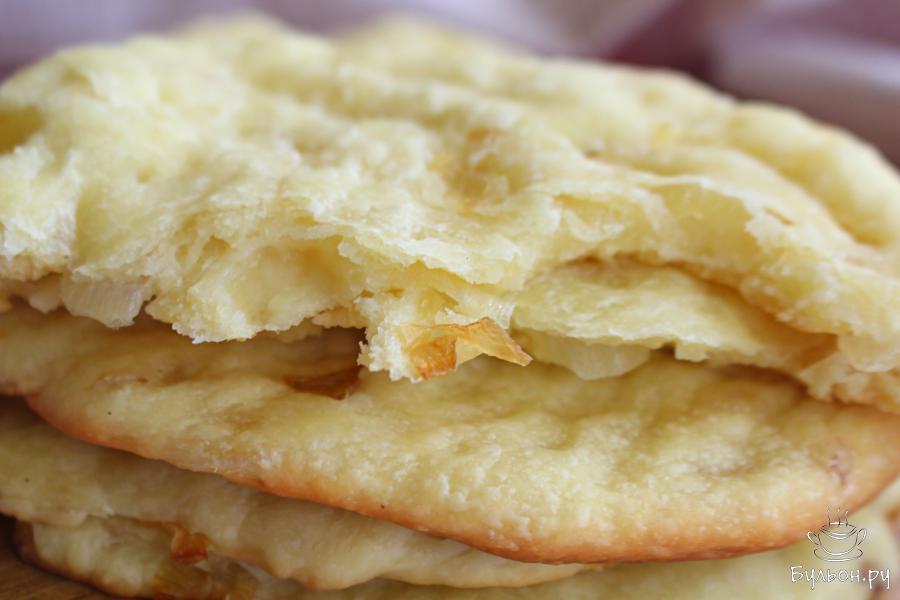 Дрожжевые лепешки с луком в духовке готовить не быстро, но результат стоит ожиданий. Из самых доступных продуктов у вас получится замечательная выпечка. Лепешки получаются мягкие, нежные, вкусные и съедаются они мгновенно. Луковицу для приготовления берите крупную, а вообще количество лука тут можно увеличить до 250 г. Если вы берете много лука, то обжаривайте его до прозрачности, чтобы объем лука хорошо уменьшился. Чем толще раскатаны лепешки, тем пышнее они будут в готовом виде. Из этого количества теста можно приготовить либо 6 лепешек потоньше, либо 4 толстенькие лепешки.