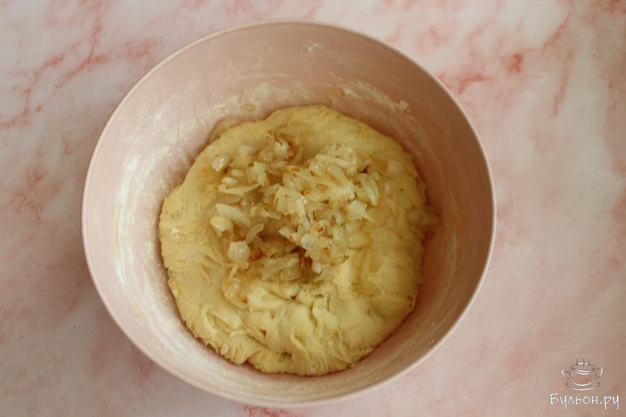 7. Когда тесто увеличится, добавить в чашку обжаренный лук с маслом. Тщательно вымесить тесто руками. Теперь тесто не будет липнуть к рукам.
