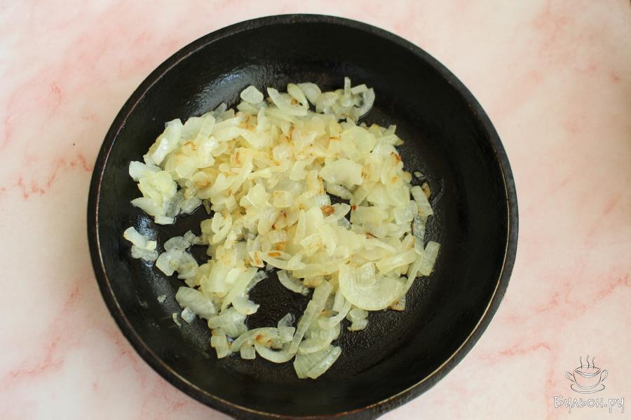 6. На сковороде разогреть растительное масло и обжарить до мягкости мелко нарезанный лук. Убрать посуду с огня.