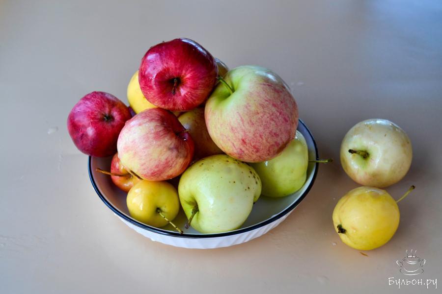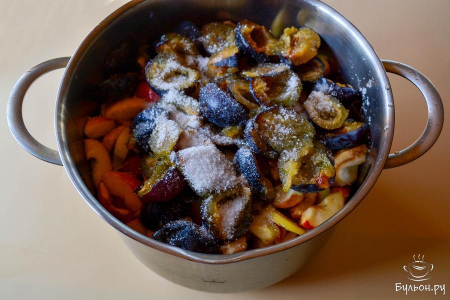 3. Яблоки разрежьте, удалите семена, положите в кастрюлю. Добавьте сливы, разрезанные на половинки, посыпьте сахаром. Встряхните кастрюлю, оставьте на несколько часов, чтобы фрукты дали сок.