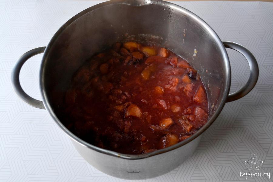 5. На самом тихом огне доведите до кипения, время от времени перемешивайте фрукты, чтобы быстрее проварились. Варите до мягкости примерно 30 минут.