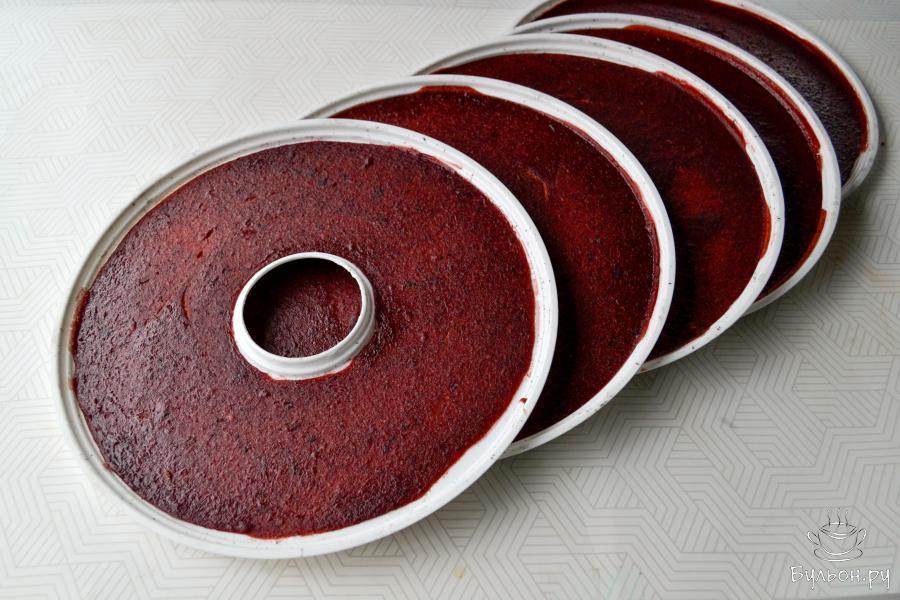 7. Поддоны для сушилки смажьте тонким слоем растительного масла. Удобно чуть смочить ватный диск маслом и протереть этим диском поддоны. Разложите фруктовое пюре на поддоны, слоем не менее 1 см. Поставьте в сушилку. Во время сушки меняйте поддоны местами.