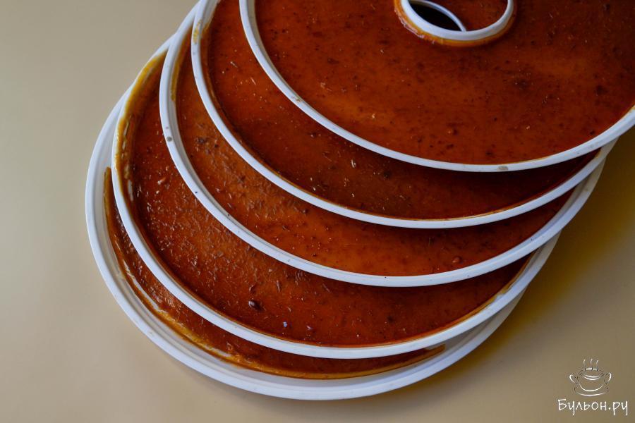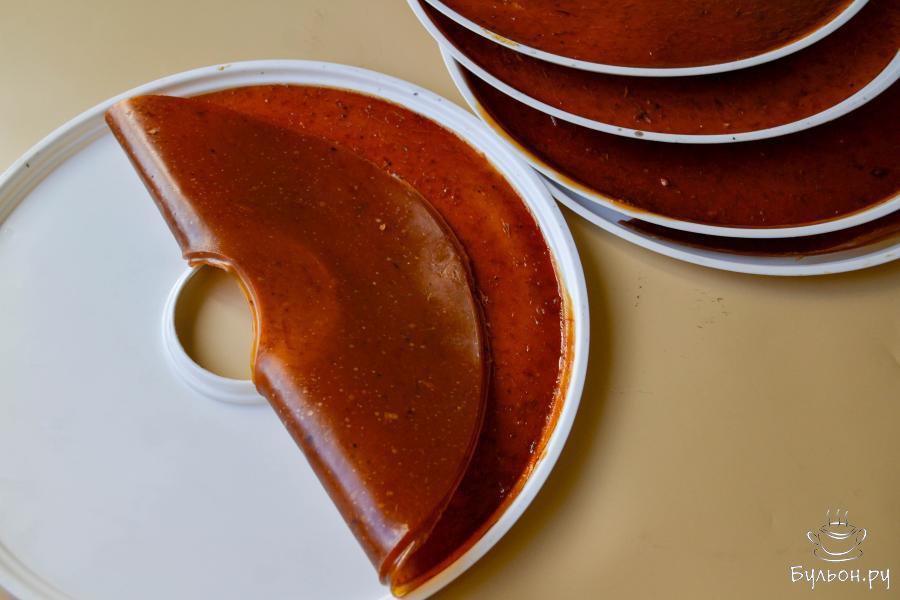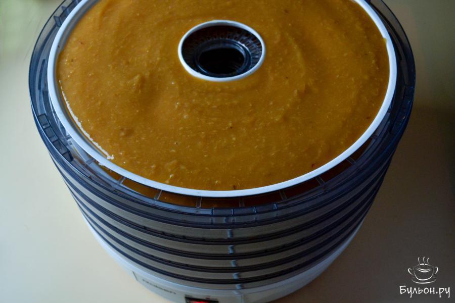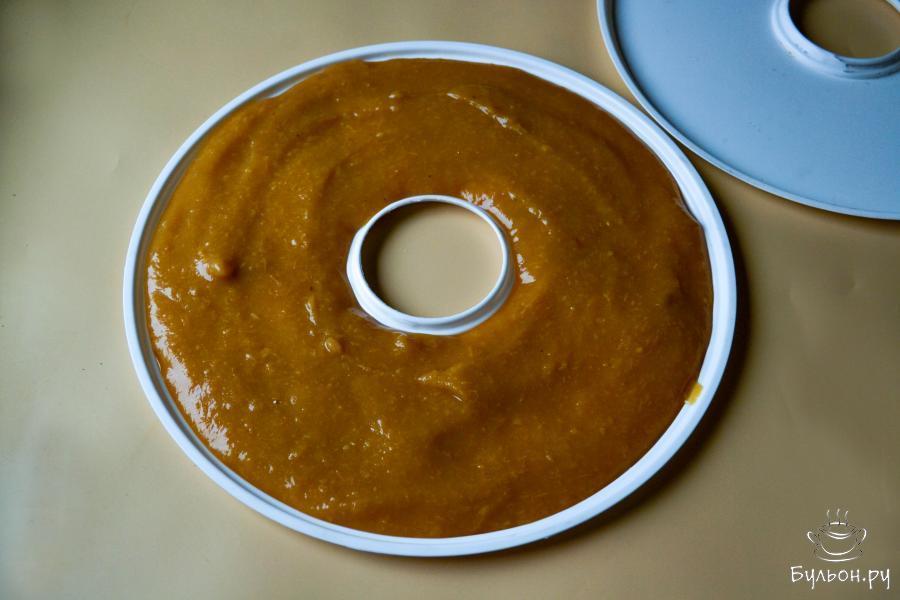 7. Поддоны для сушки слегка смажьте растительным маслом и положите фруктовое пюре слоем примерно 8-10 мм.