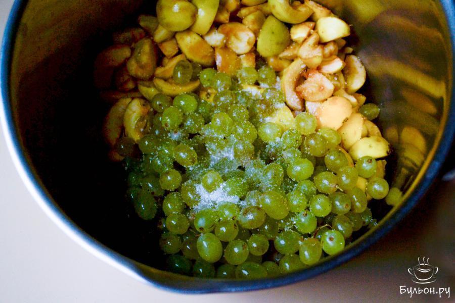 4. Положите нарезанные яблоки и виноград в кастрюлю, присыпьте сахаром и оставьте на несколько часов, чтобы дали сок. Удобно засыпать фрукты вечером, чтобы утром начать готовить пастилу.
