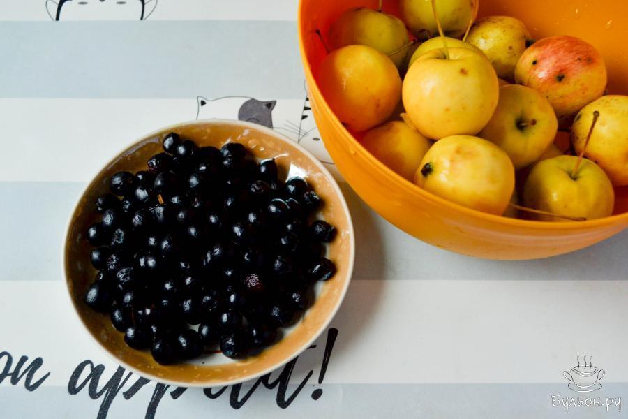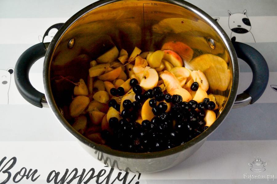 2. Яблоки разрежьте на дольки, положите в кастрюлю, добавьте черноплодную рябину. Влейте воду и поставьте кастрюлю на огонь.