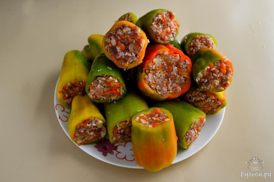 9. Для приготовления, перцы в замороженном виде положите в кастрюлю, залейте горячей водой со сметанным или томатным соусом и готовьте примерно 30-40 минут, до готовности.