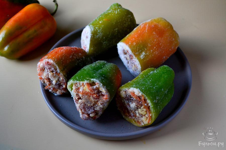 8. Уложите перцы в полиэтиленовые пакеты, в зависимости от того, сколько штук понадобится для приготовления за один раз. Перцы укладывайте так, чтобы они не соприкасались друг с другом. Пакеты плотно завяжите и уберите в морозильную камеру.