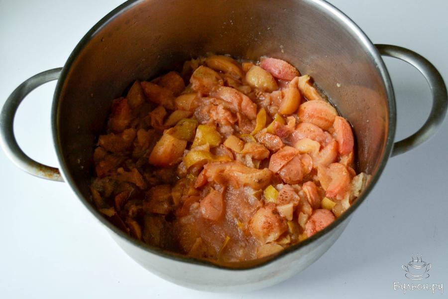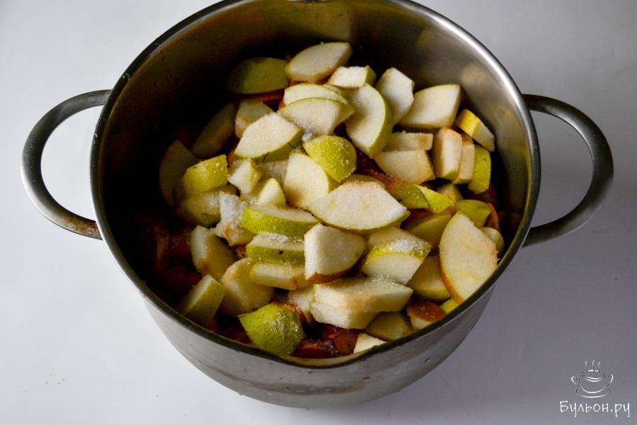 2. В кастрюлю положите нарезанные фрукты, добавьте сахар, встряхните кастрюлю и оставьте на несколько часов, чтобы дали сок. Я оставила кастрюлю на ночь.