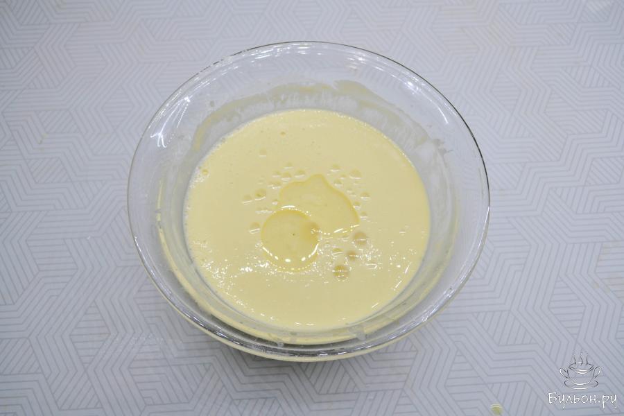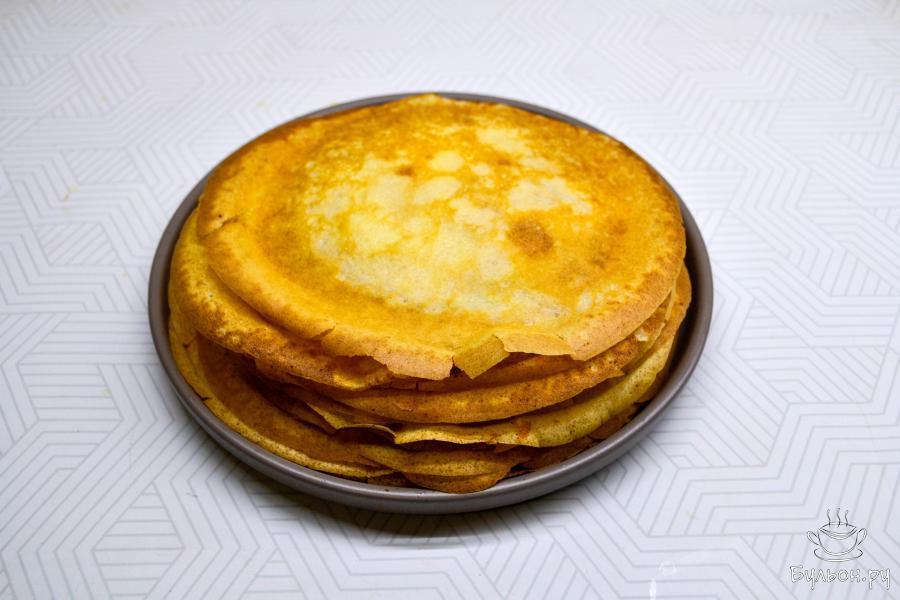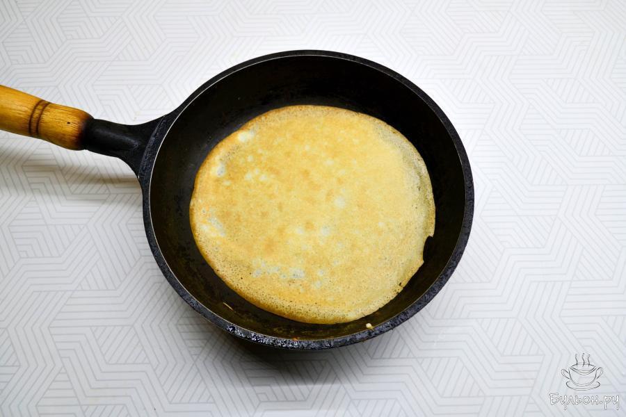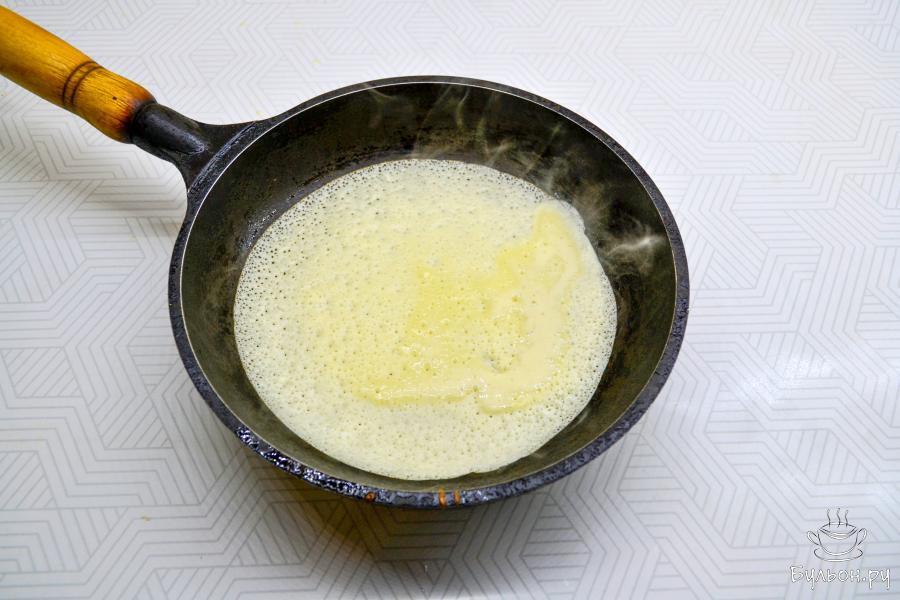 6. Хорошо разогрейте сковороду. Перед выпечкой первого блина смажьте сковороду растительным маслом и вылейте тесто тонким слоем.