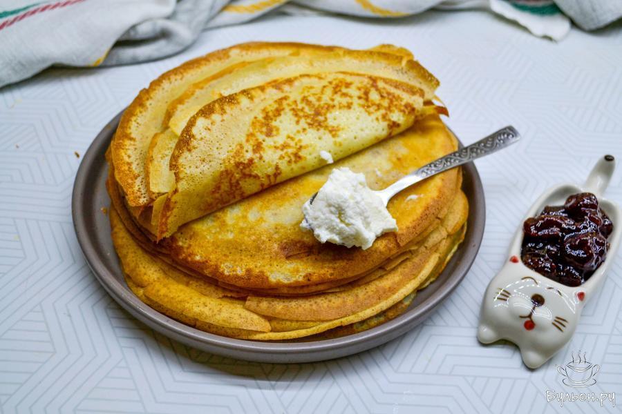 Тонкие блины на кефире и кипятке получаются ажурные, нежные, мягкие и очень вкусные. Кипяток заваривает блинное тесто. Блины получаются эластичные, легко жарятся и при переворачивании не рвутся. Блины можно подать со сметаной, медом, вареньем. А можно в них завернуть любую начинку. Блинчики легко свернуть трубочкой или сложить треугольником. Будут одинаково вкусны как со сладкой начинкой, так и с соленой.