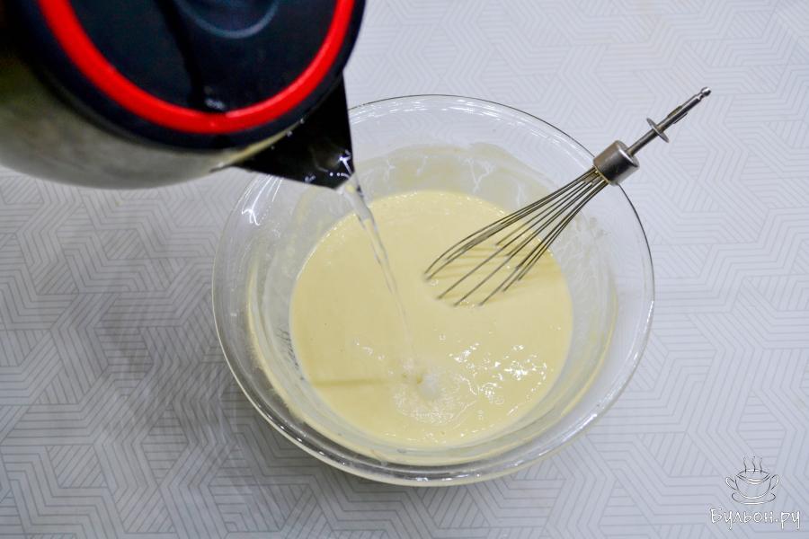 4. Влейте кипяток в тесто, при этом сразу же перемешивайте его. Оставьте тесто на столе на 10-15 минут.
