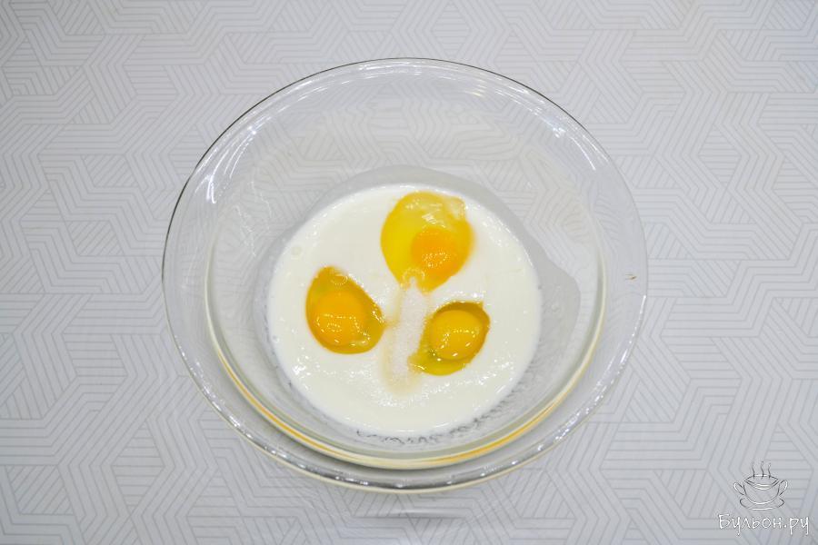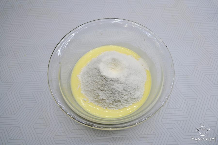 3. Тщательно перемешайте яйца с кефиром. Всыпьте просеянную муку. Тщательно при помощи венчика перемешайте тесто. Оно получается достаточно густым.