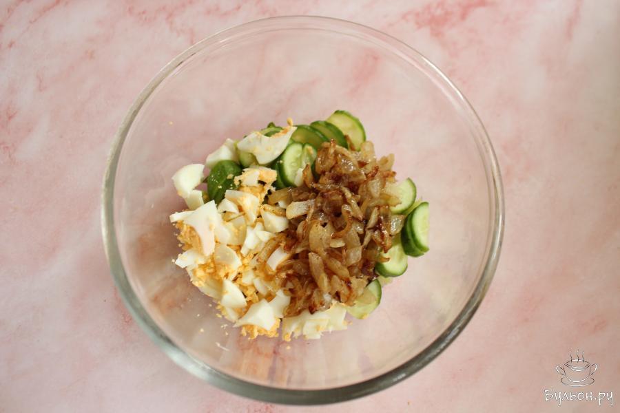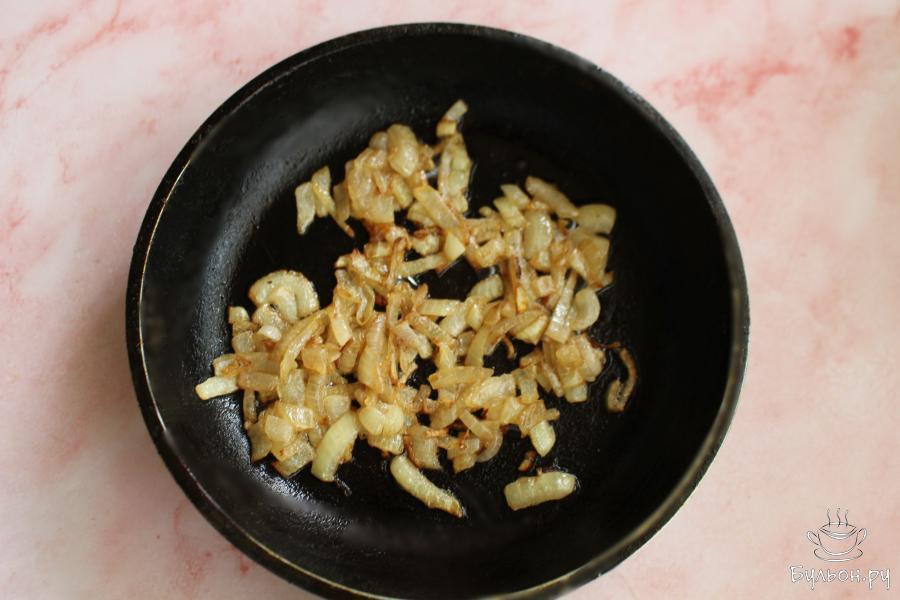 2. Пока сердечки варятся, лук нарезать мелко и обжарить его до румяного цвета на сковороде с маслом. И сварить вкрутую яйца, 10 минут после закипания воды.