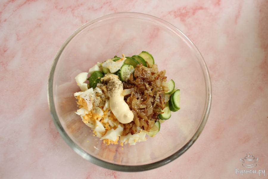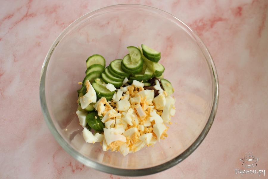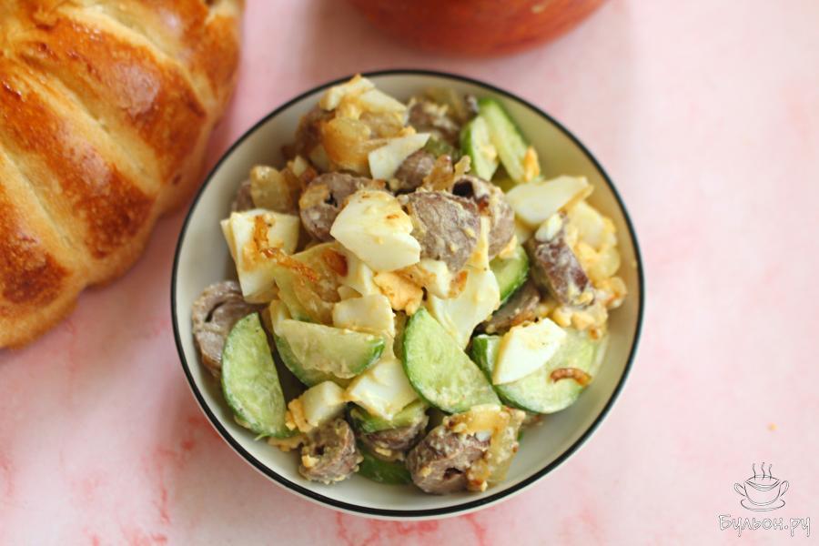 Порцией этого сытного салата вполне можно заменить ужин. Готовить такой салат просто. Салат с куриными сердечками, огурцами и яйцом получается насыщенный, вкусный и аппетитный. Если вы не любите майонез, то салат можно заправить сметаной или даже растительным маслом. Если вы любите салаты с морковью, то можно натереть грамм 100-150 моркови через крупную терку и обжарить ее с луком. В салат можно добавить любимую мелко нарезанную зелень. Этот салат понравится всем любителям блюд с субпродуктами.