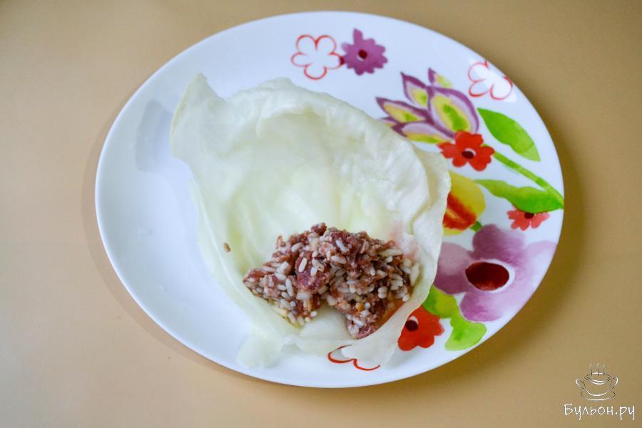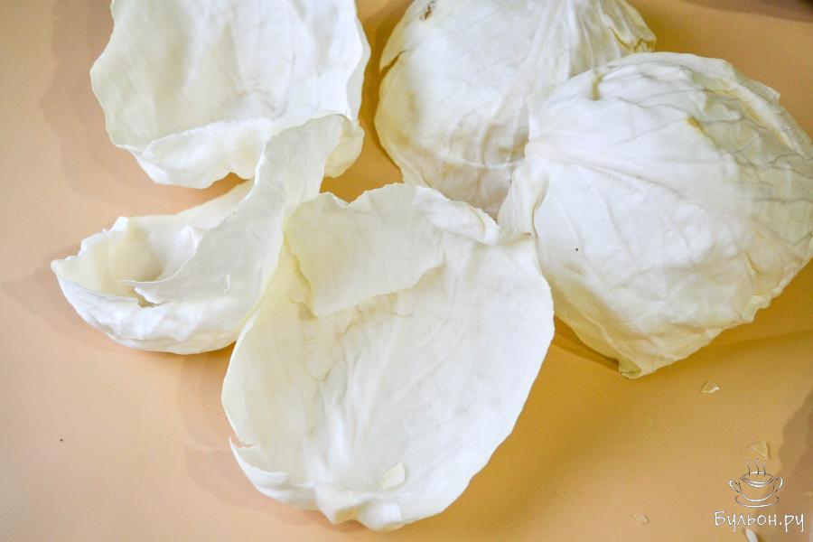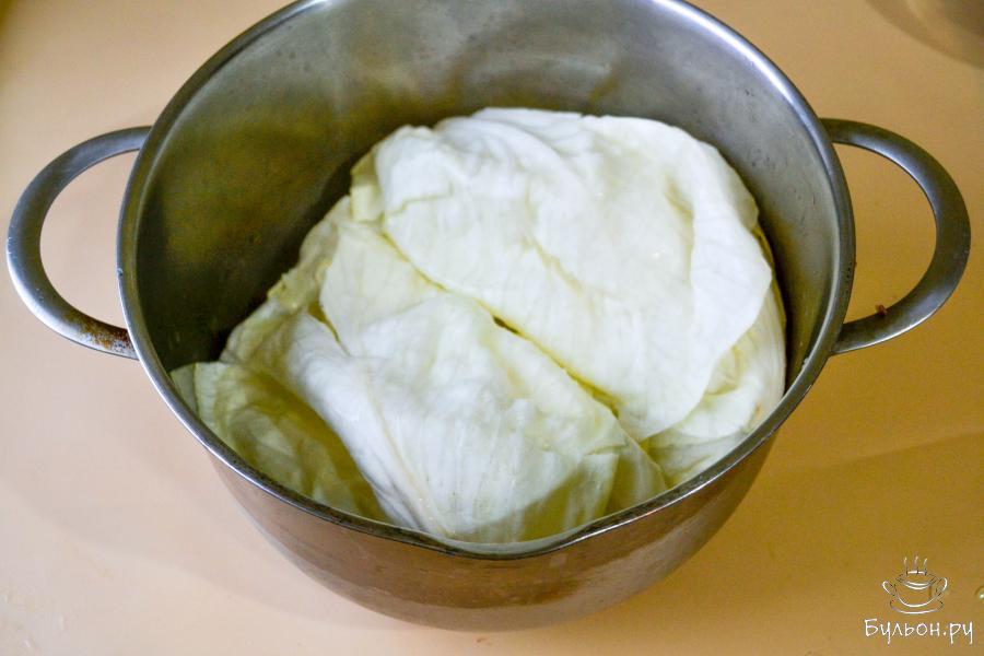 6. В кипящую воду опустите капустные листья на 1-2 минуты, чтобы стали мягче. Затем выловите листья из кастрюли и слегка остудите. Срежьте ножом утолщение у основания листа.