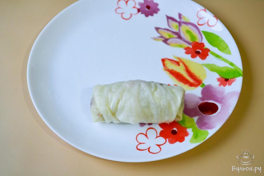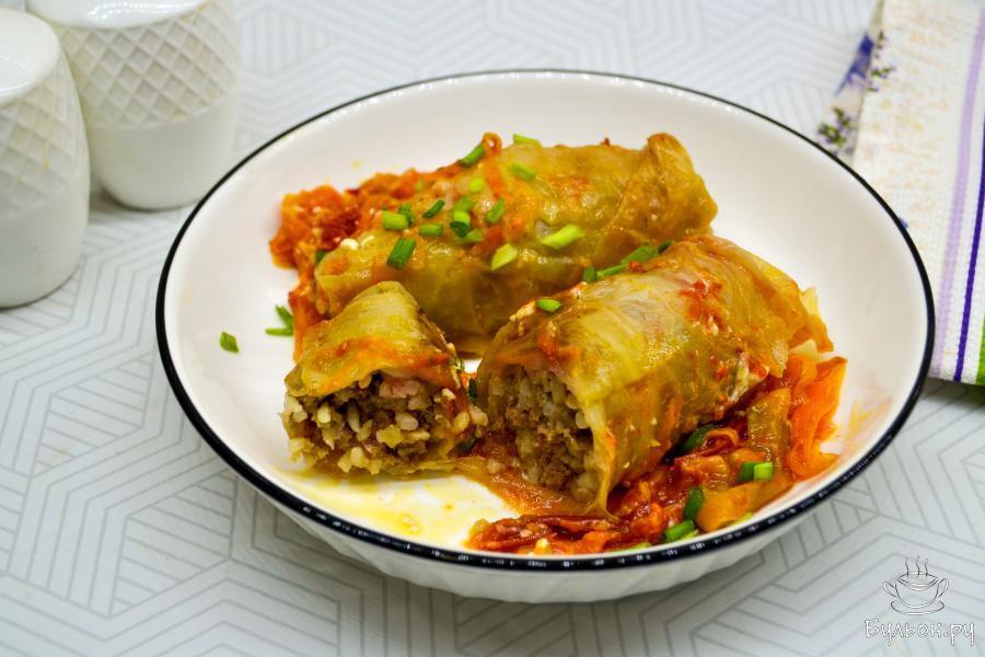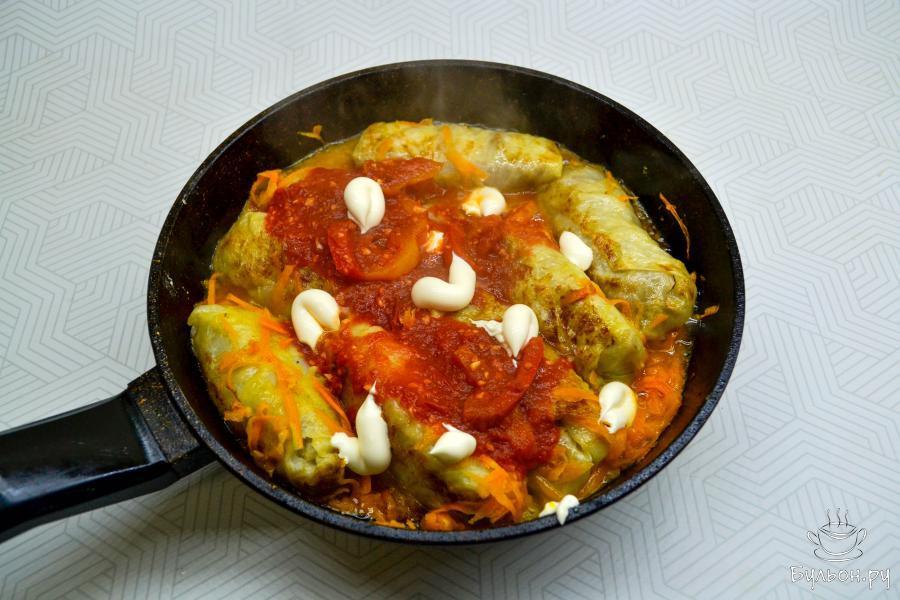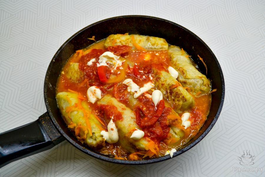 14. Затем уменьшите огонь и тушите голубцы до полной готовности примерно 45-50 минут. Если голубцы были заморожены, то время тушения увеличьте на 5-8 минут.